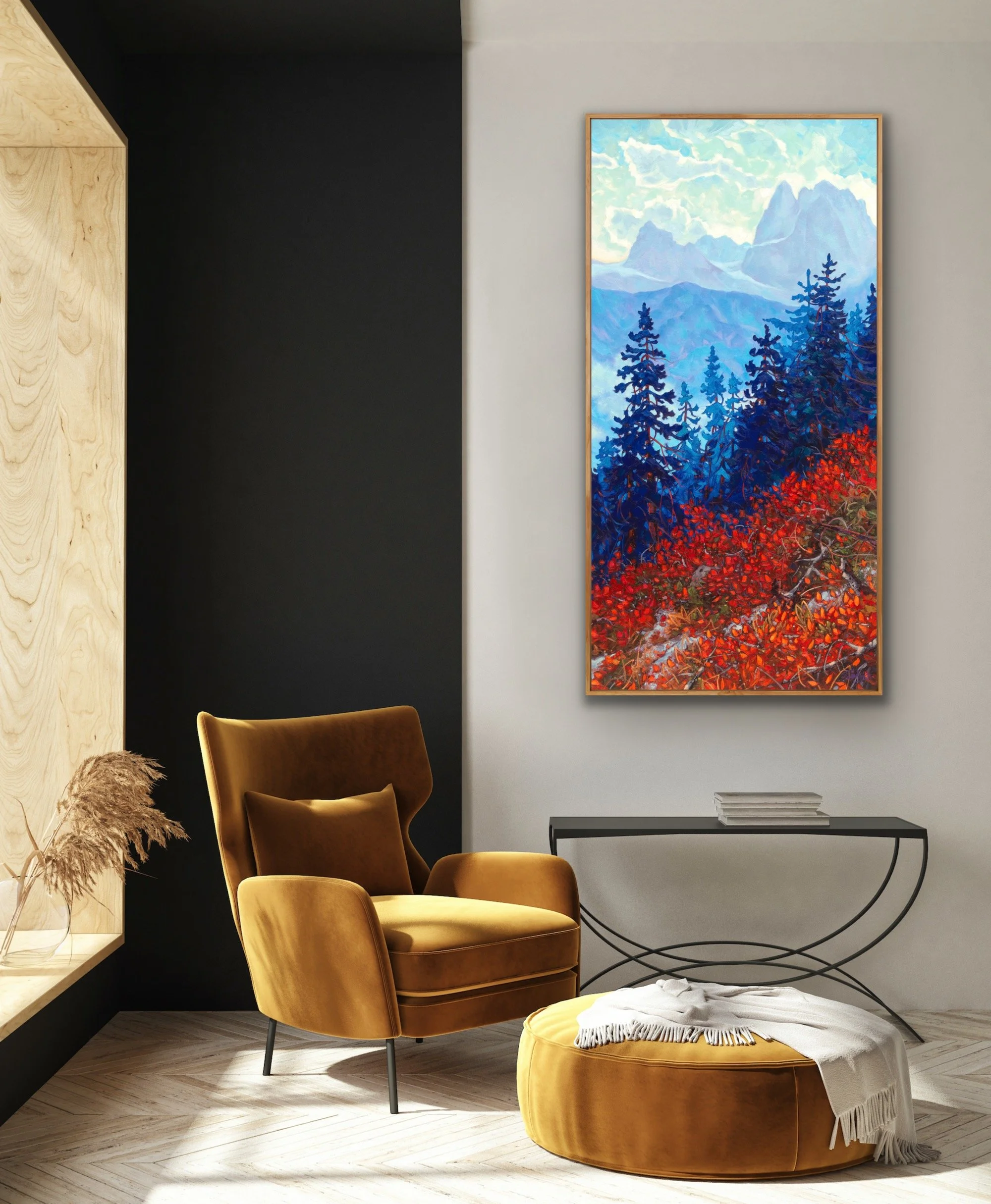 Original painting was inspired by month long hiking trip into the heart of Kootenays region in south east British Columbia. September proved to be an amazing month to spend hiking in the high alpine which was turning into incredible hues of red, orange and yellow.