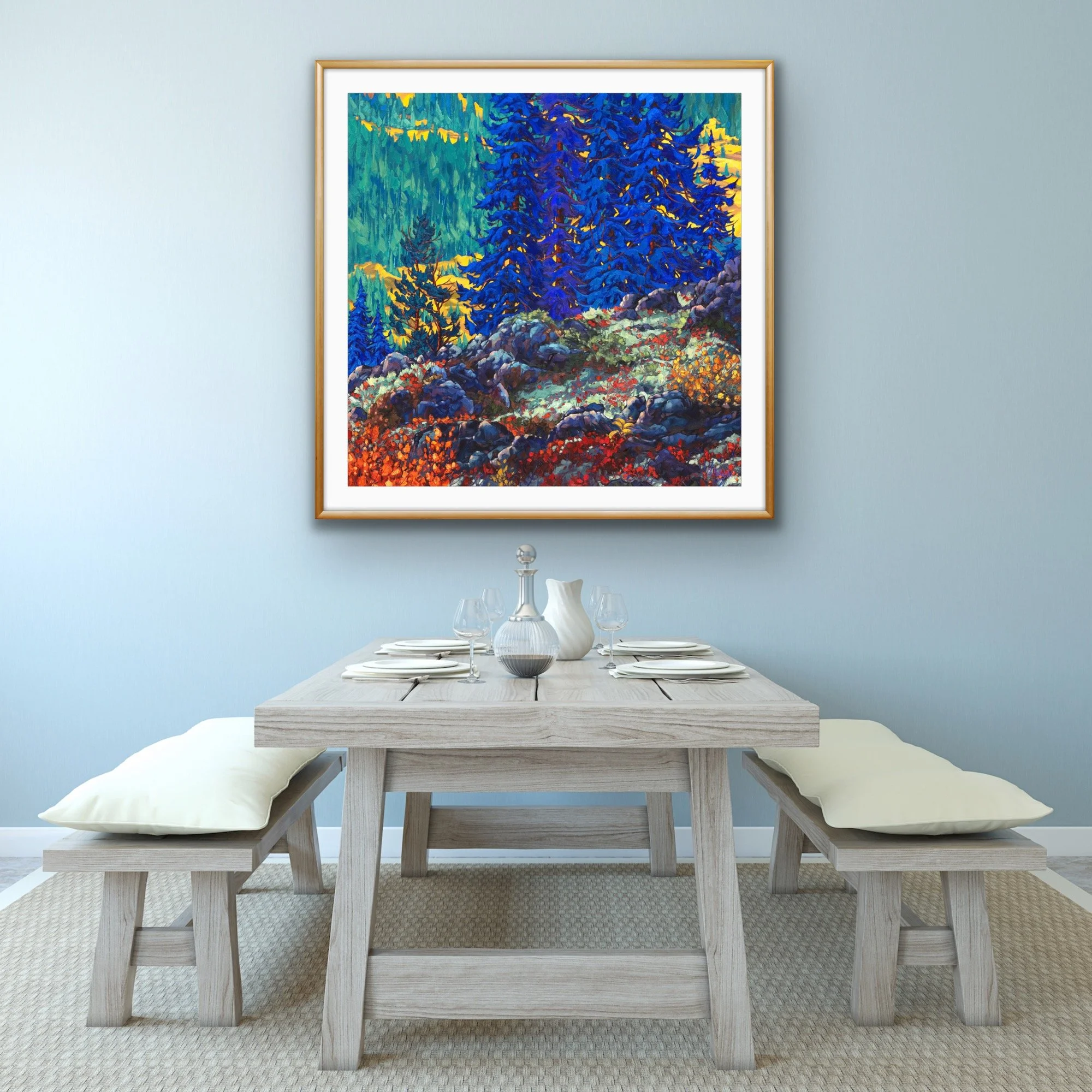 Print is made on Epson Exhibition Canvas Matte which is a bright white, consistent poly-cotton blend that is acid-free and pH neutral. Coated in semi-gloss varnish with black edges and stretched on kiln dried gallery stretcher 1.5" thick, ready to hang.